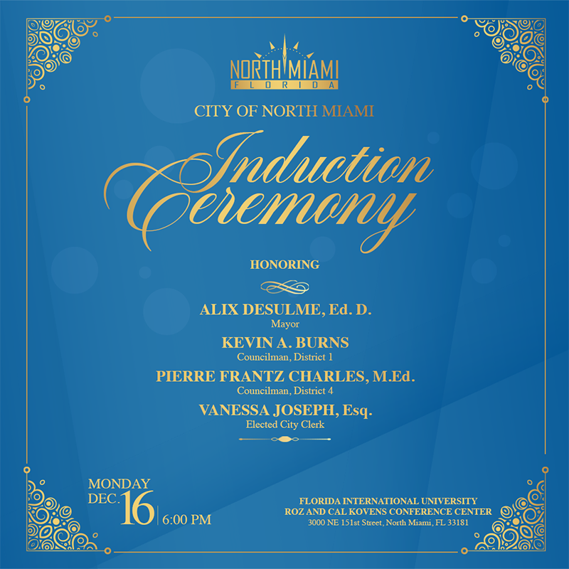 The City of North Miami invites members of the community to the 2024 Induction Ceremony, celebrating the elections of Mayor Alix Desulme, Ed.D.; Councilman Kevin A. Burns, District 1; Councilman Pierre Frantz Charles, M.Ed., District 4; and the re-election of Vanessa Joseph, Esq., Elected City Clerk.