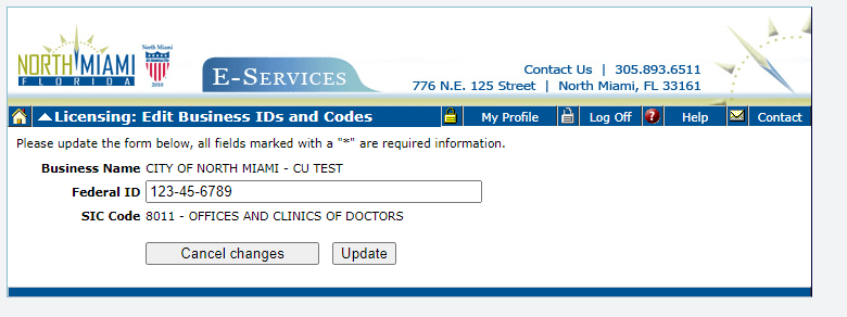 Click Connect Account - at this point you can correct if is any mistake in your Federal tax ID.Click Cancel Changes if is correct, or update the information if made changes, and send an email to btr@nortmiamifl.gov with the reason why you change the information.